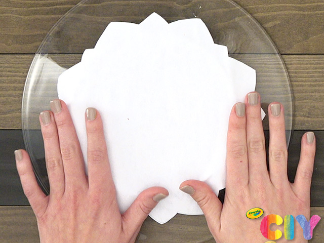 Turn a clear plate upside down. Using the plate for size reference, cut your coloring page into a unique design.