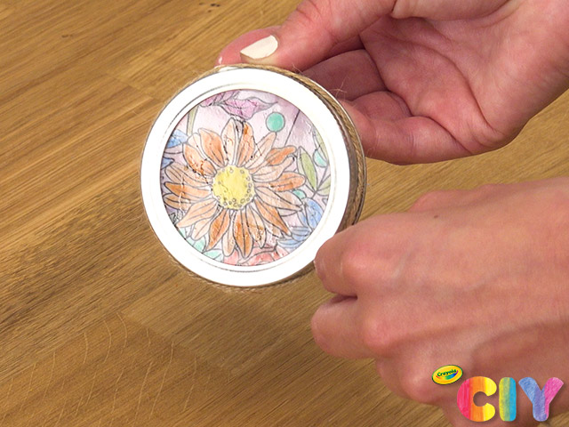 Add dab of glue to top of lid. Wrap twine around lid twice. Dry 1–2 hours.