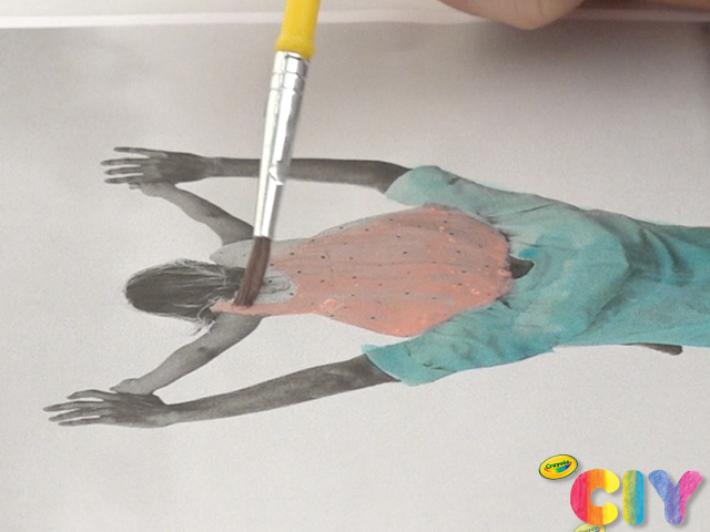 On the printed black and white photo, use paint brush and watercolors to paint in areas you want to highlight. Dry 1–2 hours.