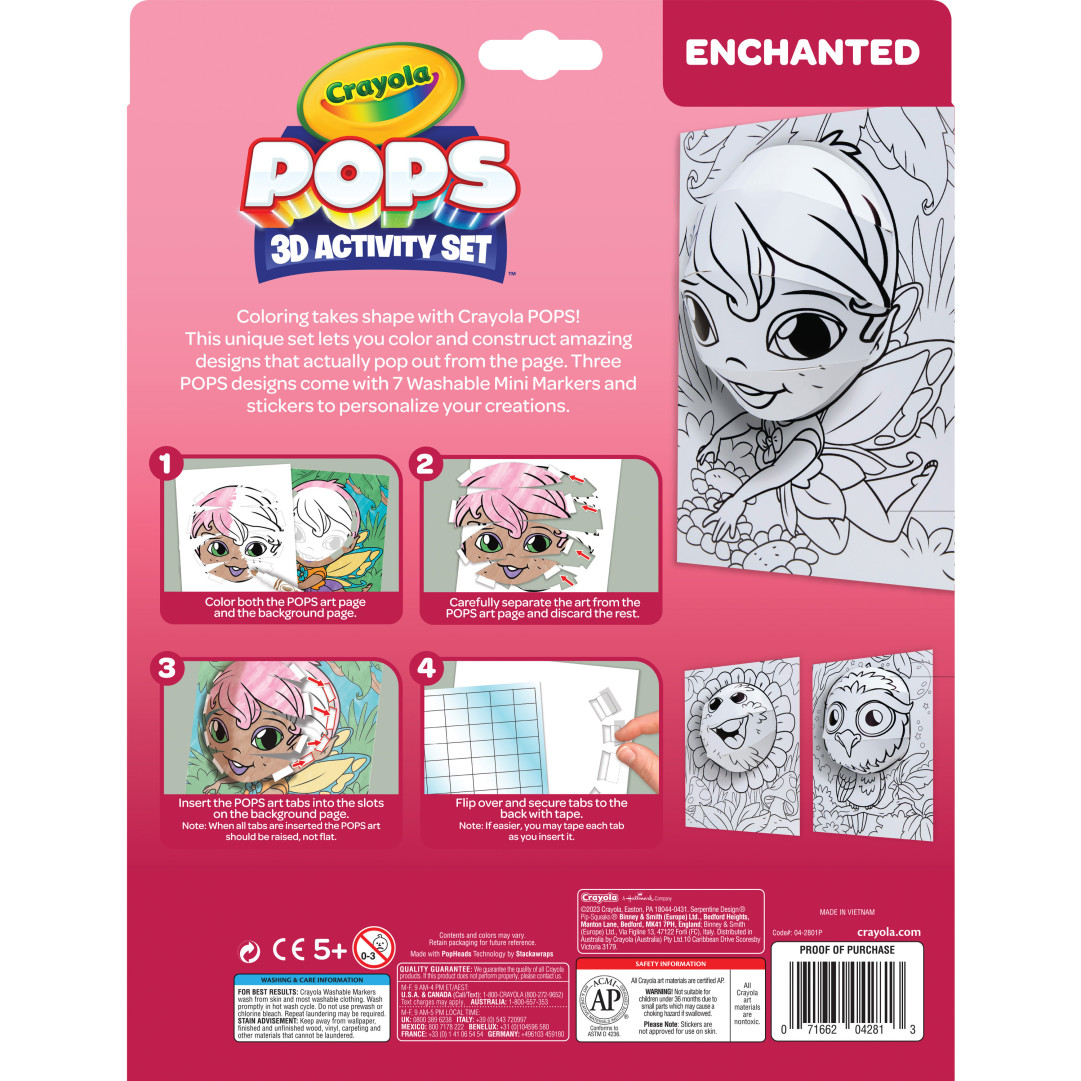 • Bring your images to life with Crayola POPS 3D Activity Set - Enchanted. This unique set lets you color and construct amazing designs that actually pop out from the page! Simply color both the POPS art page and the Background page. Carefully separate the art from the POPS art page, affix tabs into the slots on the background page and watch as the 3D artwork takes shape! Each pack includes 3 POPS designs, 7 Washable Mini Markers and stickers to personalize your creations.