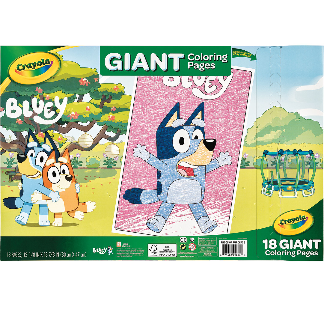 • Crayola Giant Coloring Pages featuring Bluey lets kids color Bluey, Bingo, Bandit and other characters from the popular television show! This collection features 18 supersized pages of adventure scenes and characters. These huge pages are 30cm x 47cm each, giving kids plenty of extra room to get creative! Kids can create their own poster art as the loose pages can easily be hung on bedroom walls! The convenient folder style packaging holds and protects used and unused pages. Perfect for any gifting occasion. Pair with a box of Crayola Crayons, Markers or Pencils (sold separately) so artists can get started right away! For kids ages 3+