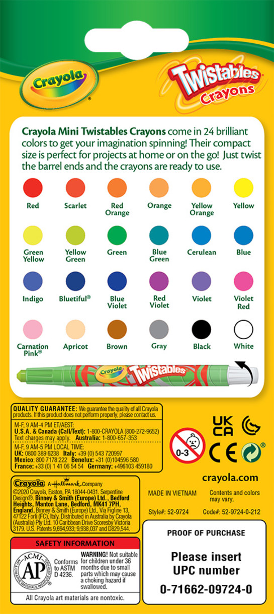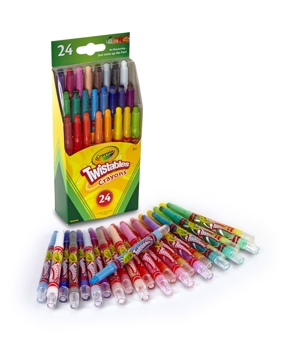 • 24 Mini Twistables Crayons with brilliant colors and smoother laydown. Crayola Twistables Crayons require no sharpening or peeling of paper label, resulting in less mess. The 6mm thick strong Non Toxic leads are protected in the plastic barrel meaning there is little or no waste and crayon can be used to the very end. Twistables Crayons are soft enough to blend yet hard enough to resist wear. Age 3+