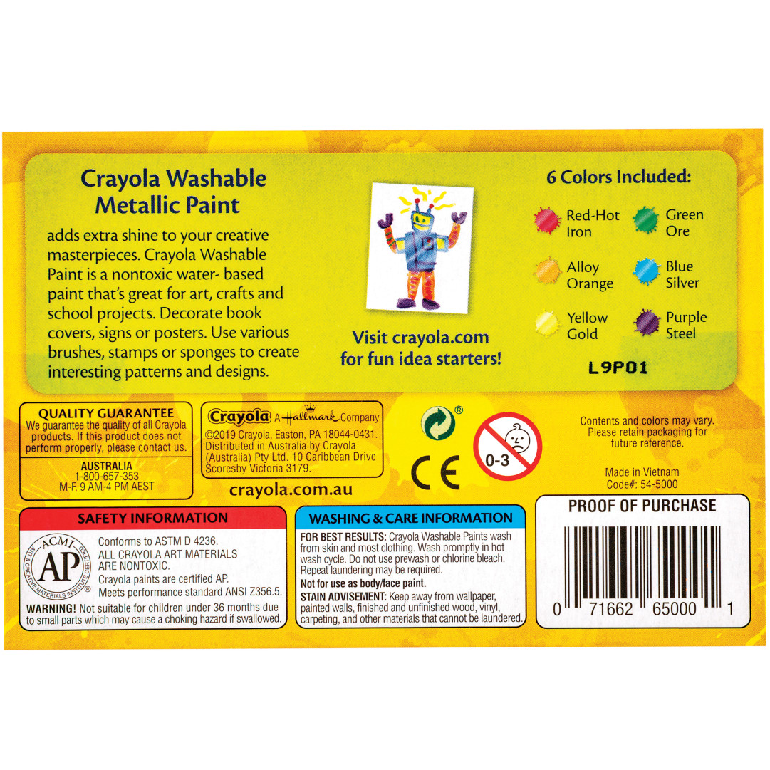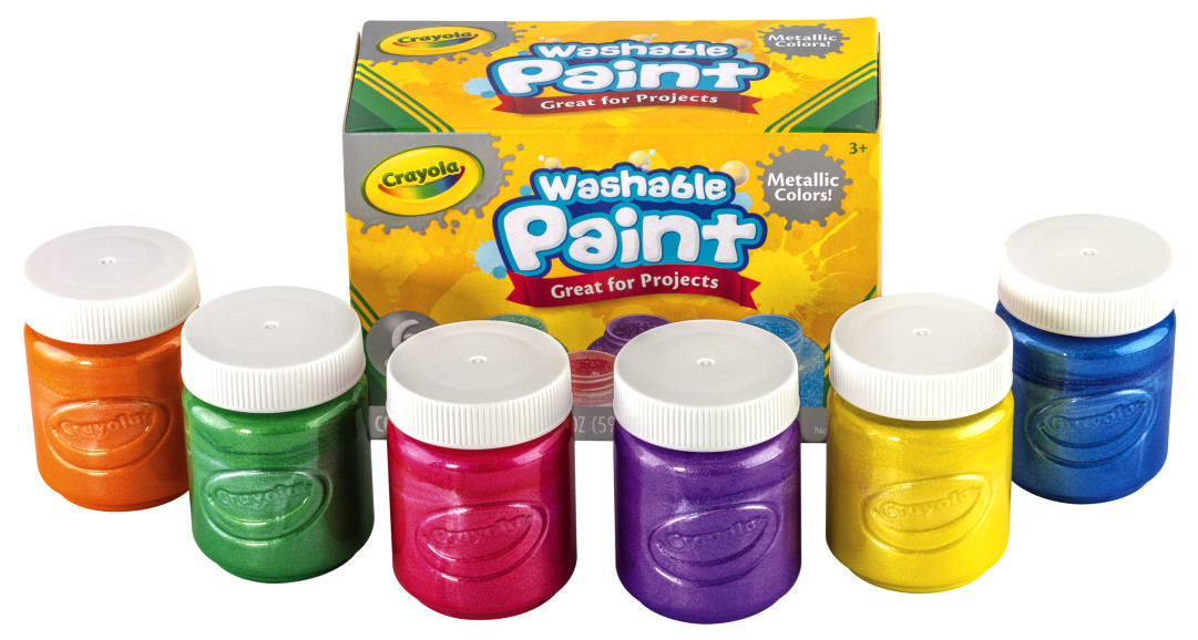• Crayola Metallic Paint adds extra shine to your creative masterpieces. Crayola Washable Kids' Paint is a non-toxic water-based paint that’s great for art, crafts and school projects. Decorate book covers, signs or posters. Use various brushes, stamps or sponges to create interesting patterns and designs. Colors include: red-hot iron, alloy orange, yellow gold, green ore, blue silver, purple steel. Age 3+