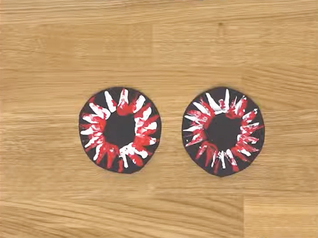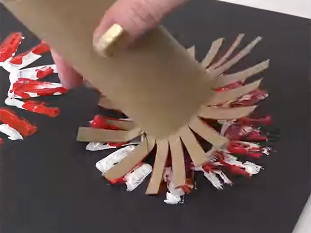Pour out 3 colours of Crayola Washable Kids’ Paint onto 3 small paper plates. Dip the fanned cardboard tube into one of the paint colours and gently stamp the paint onto a sheet of black cardstock twice, creating two separate firework explosions.