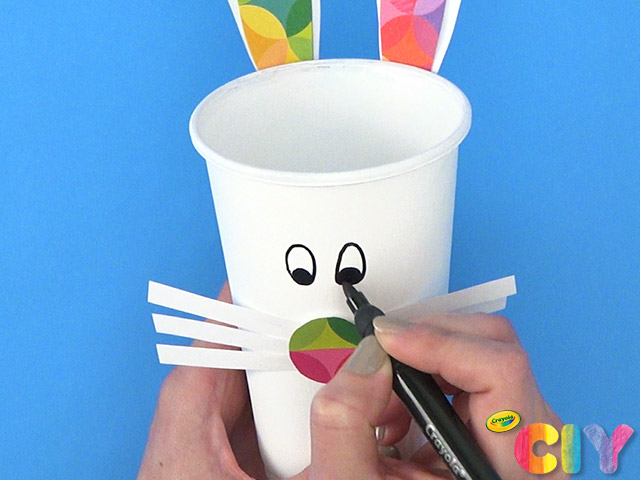 Glue whiskers to front of cup. Glue nose on top of whiskers. Let all glue steps dry 1–2 hours.