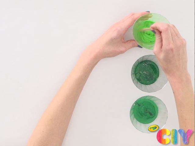 Place a disposable cup upside-down on a disposable plate, and place the flower pot upside-down on top of the cup. Pour paint mixtures on top of flower pot, letting the paint drip down the sides. Let dry 3-4 hours.