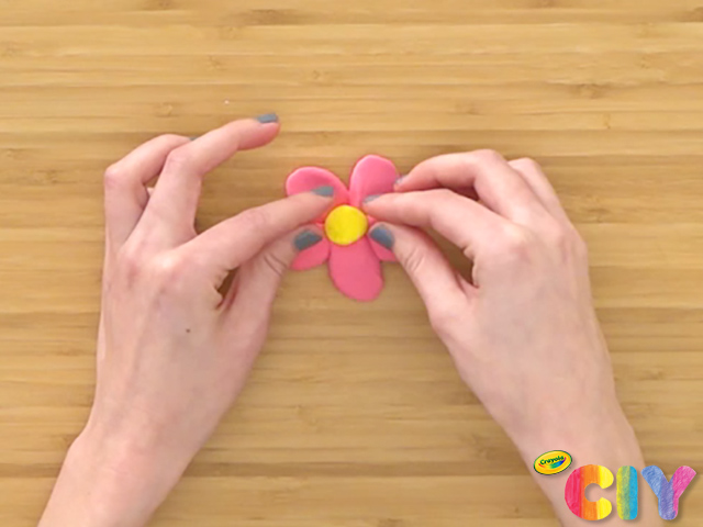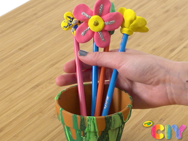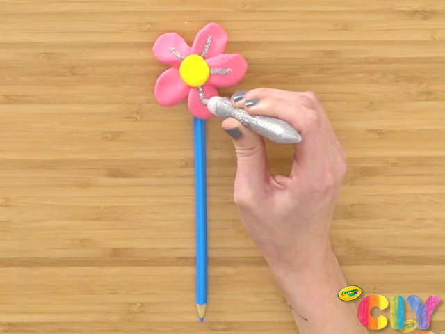Roll a piece of Model Magic into a ball so that it is approximately 1” in diameter. Form the ball around the end of a colored pencil. Press the flowers and leaves against the ball to attach.
