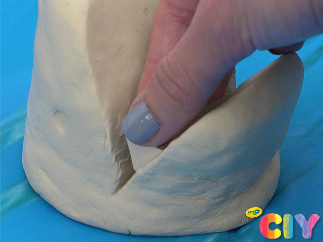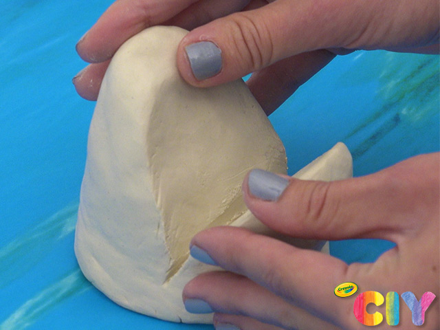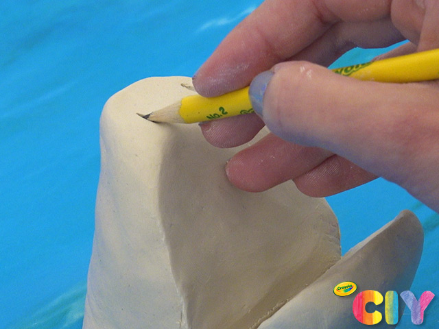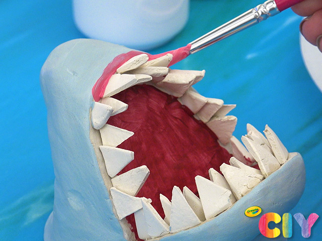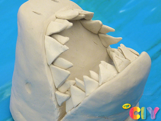 Cut small piece of clay into triangle shape. Press down to attach inside shark’s mouth.