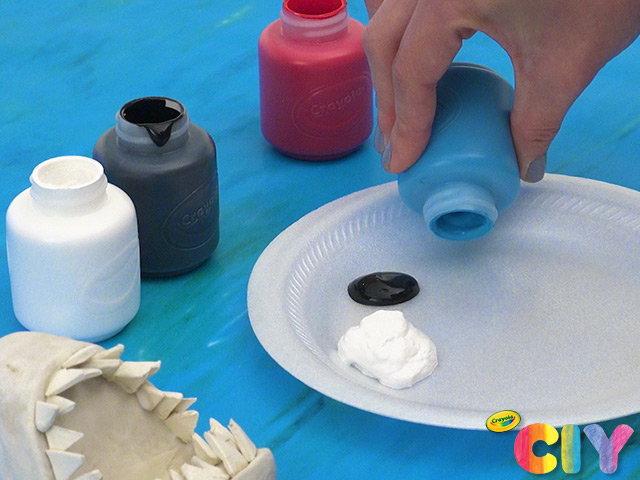 Mix paints together to create desired shades, and paint shark body and mouth. Dry 1–2 hours.