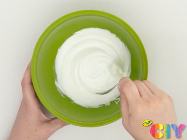 Pour 3/4 cup glue, 1/8 tsp baking soda, and 1 Tbsp lotion into a bowl, stirring well with a craft stick until completely mixed.