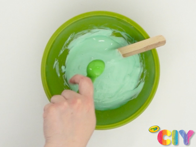 • If slime is still too sticky after adding 3 tsp contact lens solution, add extra contact lens solution in small increments until the slime mixture easily slides out of the bowl. If needed, add a small amount of contact lens solution to your hands and rub them together before removing the slime from the bowl.
