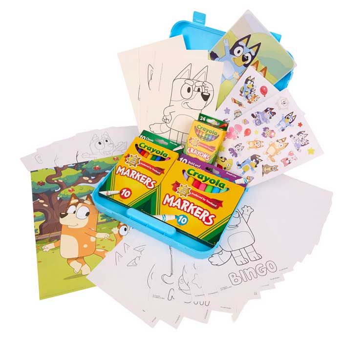 • Get creative with the Crayola Bluey Create & Color Art Case! Packed with crayons, markers, coloring pages, stickers, and character standees, this kit has everything kids need to bring Bluey adventures to life. Color scenes from the show or make your own with blank pages and fun art tools. The Bluey-themed storage case keeps supplies organized and ready for travel. Whether at home or on the go, kids can dive into hours of coloring fun. Safe and nontoxic, it’s the perfect gift for Bluey fans ages 5 and up who love art, imagination, and play.