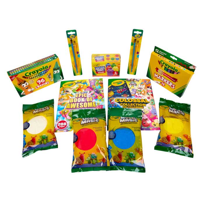 • 125 ART SUPPLIES IN ONE BOX: Crayons, markers, paints, brushes, Model Magic, and two giant coloring books—all packed in a reusable, kid-friendly storage case.