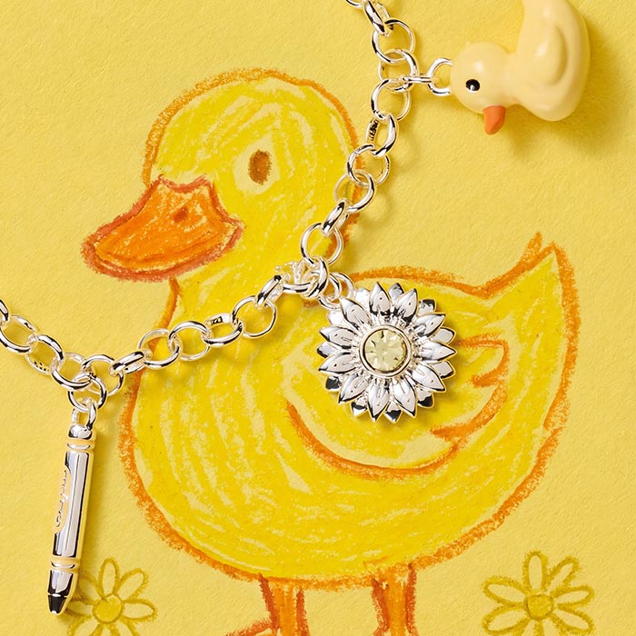 The Sunglow bracelet showcases five whimsical charms—a cheerful rubber duck, crystal-studded sunflower, vibrant crayon, sunny lemon, and adorable bee—each featuring dimensional details and enamel finishes. Inspired by the joy of creative expression, this playful piece captures the magic of imagination and childhood wonder.