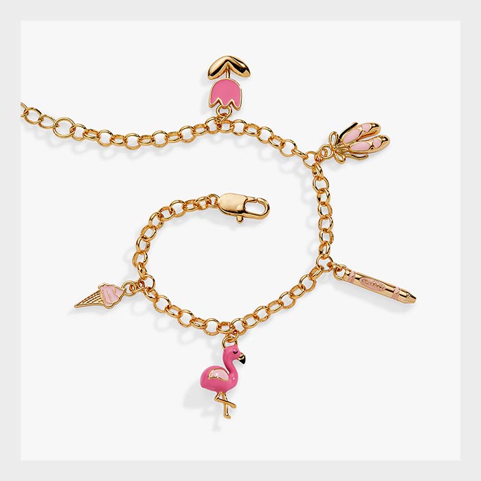 The Tickle Me Pink bracelet celebrates all things pink and fun. From a cheerful flamingo and twirly ballet slippers to a sweet ice cream cone, sharpened pencil, and blooming tulip, each charm tells its own colorful story. Perfect for expressing your playful personality and love of iconic Crayola colors.