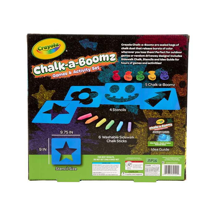 • The Crayola Chalk‑A‑Boomz Outdoor Activity Kit delivers instant color‑filled fun with everything kids need for energetic, creative play. Toss the washable chalk balls to watch bright splashes appear on sidewalks, then use the included stencils and sidewalk chalk sticks to design custom games and vibrant outdoor art. Perfect for families, parties, and neighborhood playdates, Chalk‑A‑Boomz brings kids together through teamwork, laughter, and bold bursts of color. This all‑in‑one outdoor kit keeps children active while sparking imaginative play—and cleanup is effortless. When the fun wraps up, simply wash the chalk away and get ready for the next round of colorful action.