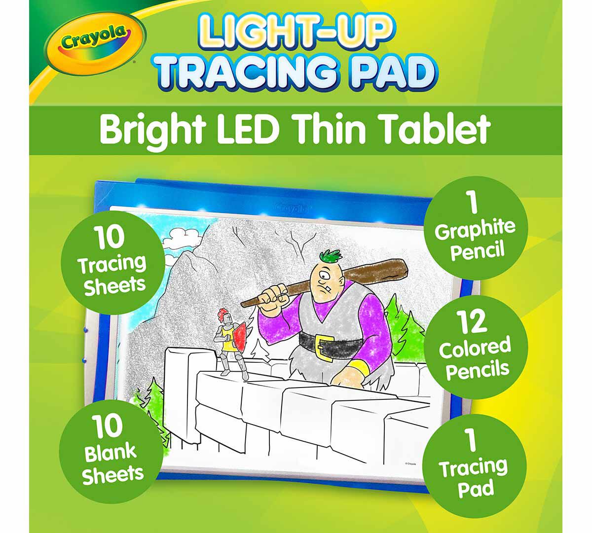 • CRAYOLA LIGHT-UP TRACING PAD: Features Blue Coloring Board, 1 Graphite Pencil, 12 Short Colored Pencils, 10 Tracing Sheets, and 10 Blank Sheets. 3 AA batteries required - sold separately.